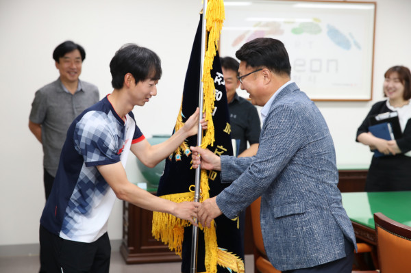 경기 이천시 정구팀이 지난 6월28일부터 이달 3일까지 경남 창녕군 종합운동장내 정구장에서 열린 ‘2018년 창녕 한국실업정구연맹전’에 참가해 단체전 우승을 차지했다. 사진은 정구팀 선수 대표가 엄태준 시장에게 우승기를 전달하고 있는 모습. (사진제공=이천시청)