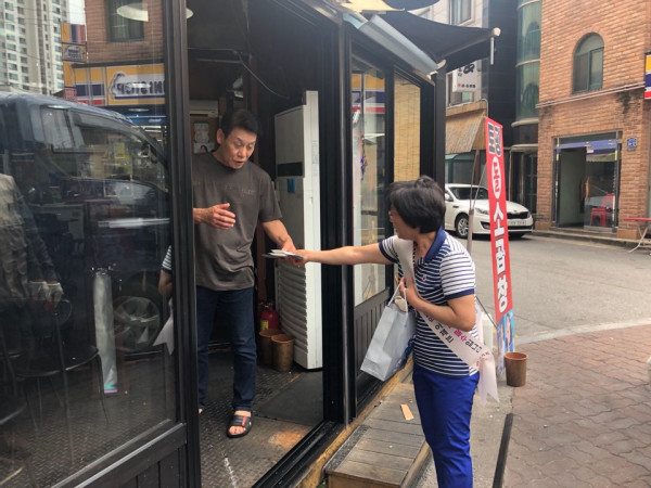 경기 구리시는 4일 소비자교육중앙회 구리시지회 회원 및 공무원 등 30여명이 참석한 가운데 ‘민관 합동 에너지 절약 홍보 캠페인’을 실시했다. 사진은 캠페인에 참석한 한 관계자가 지역내 상가를 대상으로 홍보를 하고 있는 모습. (사진제공=구리시청)