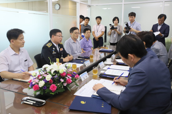 4일 서울 은평구청과 은평소방서가 구청장실에서 도시재생사업구역내 서울 안전마을 조성을 위한 기관 간 업무협약을 체결했다. 사진은 협약을 위해 토론을 진행하고 있는 관계자들의 모습. (사진제공=은평소방서)