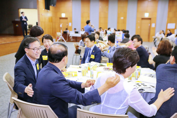 주민 100여명이 모여 지역 문제를 찾고, 함께 해결하는 ‘나풀나풀 나누고 풀고 100인+ 공론’ 2018 협치론장이 지난 4일 오후 6시30분 금천구청 대강당에서 열렸다. 이날 행사는 1부와 2부로 나눠 진행됐다. 사진은 행사에 참석한 유성훈 구청장이 참석자들과 함께 하며 즐거워하고 있는 모습. (사진제공=금천구청)