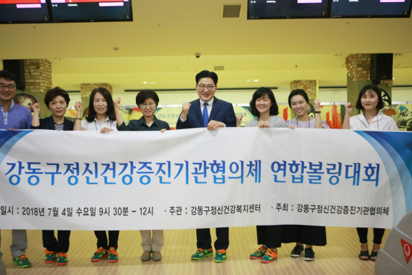 최근 서울 강동구가 강동구정신건강증진기관협의체와 함께 70명의 정신장애인과 지역내 정신건강관련 기관 등이 참여하는 ‘정신장애인 연합볼링대회’를 공동 개최했다. 사진은 관계자들과 기념촬영을 하는 이정훈 구청장(오른쪽 네번째)의 모습. (사진제공=강동구청)