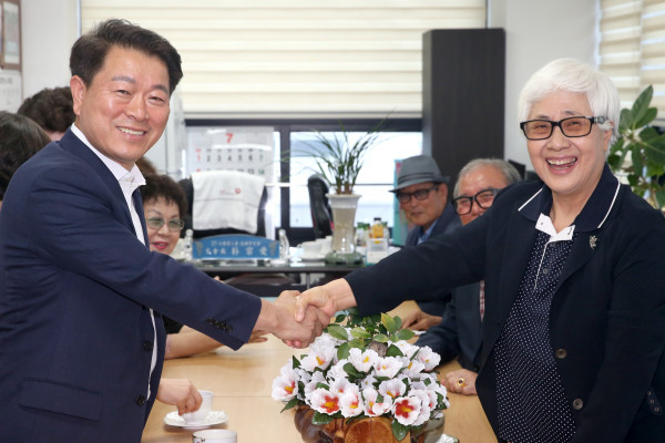박승원 경기 광명시장은 취임 첫 행보로 대한노인회 광명시지회를 찾아 지역노인들과의 대화하며 건의 및 애로사항 등을 경청했다. 사진은 박 시장(왼쪽)과 박종애 지회장이 환하게 웃으며 악수를 하고 있는 모습.(사진제공=광명시청)