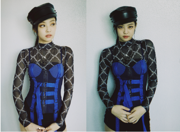 공개된 사진 속 제니는 시스루 상의와 핫팬츠 위에 코르셋 아이템을 착용해 섹시함을 부각시켰다. 핫팬츠와 함께 매치한 망사스타킹까지 제니의 매력을 완벽하게 드러냈다.