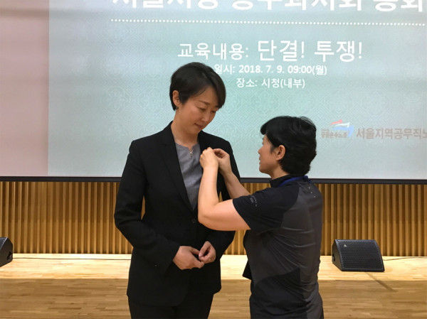 | ▲ 공공운수노조 조합원이 권수정 의원에게 시의원 배지를 달아주고 있는 모습. (사진제공=서울시의회) | ||