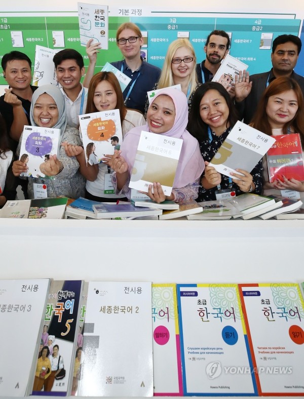 10일 오전 서울 강남구 코엑스에서 열린 '2018 세계한국어교육자대회' 세종학당 전시부스에서 해외 세종학당 교사들이 한국어책을 들고 있다.