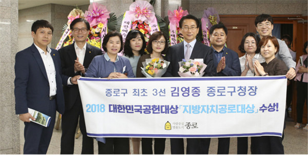 김영종 서울 종로구청장은 9일 국회헌정기념관 대강당에서 열린 2018년 대한민국공헌대상 시상식에서 지방자치공로대상을 수상했다. 사진은 김 구청장이 ‘지방자치공로대상’ 수상 후 구청 직원들과 기념촬영을 하는 모습. (사진제공=종로구청)