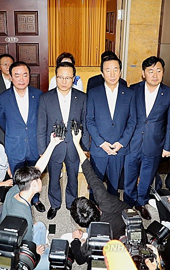 10일 오전 국회에서 열린 20대 국회 하반기 원구성을 위한 교섭단체 원내대표·부대표 회동에서 7월 국회 일정에 합의한 원내대표들이 브리핑하고 있다. 왼쪽부터 평화와정의 장병완·더불어민주당 홍영표·자유한국당 김성태·바른미래당 김관영 원내대표.