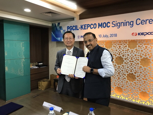 | ▲ 김종갑 한전 사장(왼쪽)과 인두 쉐크바 자 PGCIL 회장이 기념촬영을 하는 모습. | ||