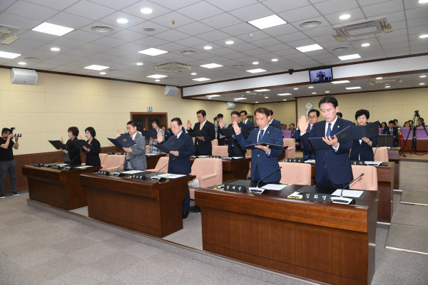 | ▲ 지난 9일 열린 ‘제8대 영등포구의회 개원식’에서 구의원들이 의원선서를 하는 모습. (사진제공=영등포구의회) | ||