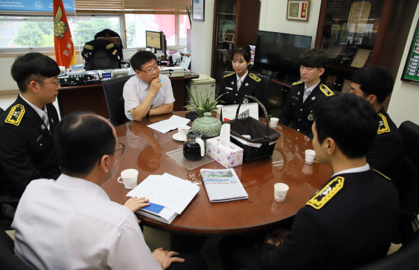 10일 서울 은평소방서에 신임 소방관 5명이 합류했다. 신임 소방관들은 앞으로 은평소방서 현장대응단 및 각 119안전센터에서 시민의 소중한 생명과 재산을 보호하는 임무를 수행하게 된다. 사진은 정재후 은평소방서장(왼쪽)이 신임 소방관들과 이야기를 나누고 있는 모습. (사진제공=은평소방서)
