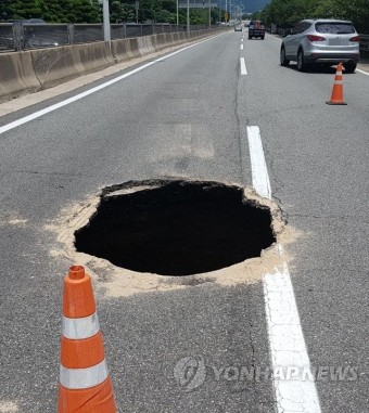 11일 낮 12시 30분께 부산 도시고속도로 번영로 원동에서 서울 방향 200m 지점에 가로 2m, 세로 1m, 깊이 5m가량의 싱크홀이 발생해 교통이 통제 중이다.