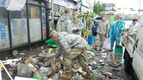 경기 동두천시 무한돌봄센터는 11일 자원봉사센터에서 연계한 미2사단 70여단 지원대대 장병과 생연2동 지역사회보장협의체 회원 등 30여명이 참여한 가운데 통합사례관리대상자 집을 청소하고 쓰레기를 수거했다. 사진은 장병들이 쓰레기를 줍고 있는 모습. (사진제공=동두천시청)