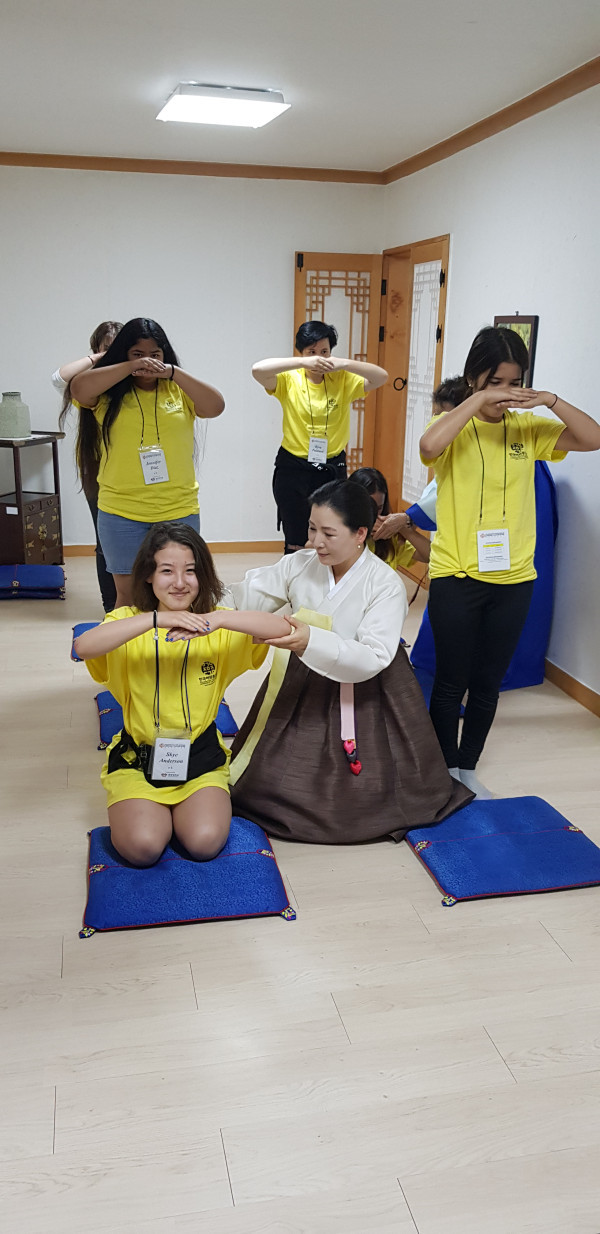 경기 용인시는 지난 11일 처인구 김량장동 소재 ‘용인시예절교육관’에서 미국 고등학교에 재학 중인 학생 35명이 참여한 가운데 ‘한국 전통예절 체험행사’를 진행했다. 사진은 전통배례 체험을 하는 미국 고등학생들의 모습. (사진제공=용인시청)