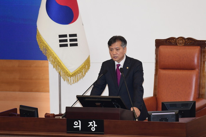 | ▲ ‘제10대 서울시의회 전반기 의장’에 당선된 신원철 의장이 의사진행을 하고 있다.(사진제공=서울시의회) | ||