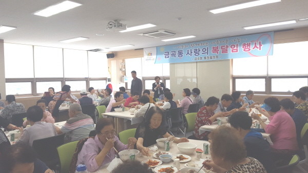 경기 수원시 권선구 금곡동통장협의회는 지난 12일 행정복지센터에서 지역내 노인 150여명을 초대해 재롱잔치 및 사랑의 복달임 행사를 개최했다. 사진은 행사에 참여한 노인들이 삼계탕을 먹고 있는 모습.(사진제공=권선구청)