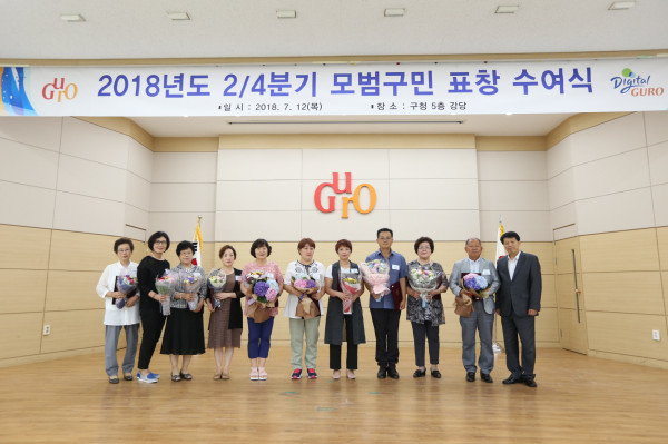 최근 구로구가 2분기 모범구민 표창 수여식을 구청 강당에서 개최했다. 사진은 표창을 받은 모범구민들이 이성 구청장(오른쪽)과 기념촬영을 하고 있는 모습. (사진제공=구로구청)
