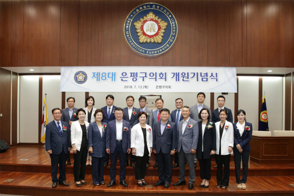 최근 서울 은평구의회는 본회의장에서 제8대 구의회 개원기념식을 열고 앞으로의 의정방향을 밝혔다. 사진은 개원기념식 후 기념촬영을 하고 있는 의원들의 모습. (사진제공=은평구의회)