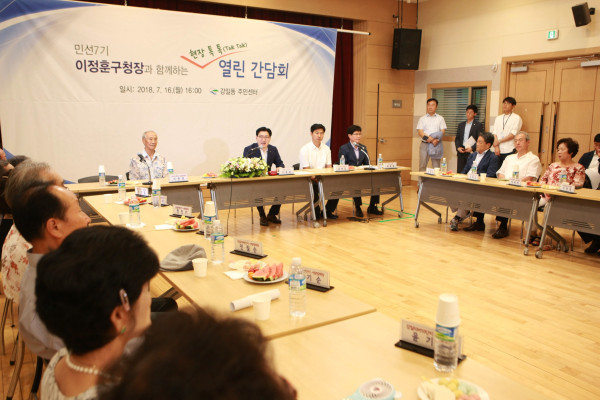 16일 이정훈 강동구청장이 지역내 전동을 순회하며 주민과 소통하는 ‘현장 톡톡(Talk Talk), 열린 간담회’를 본격 개최했다. 사진은 강일동 주민센터에서 간담회를 진행 중인 이 구청장(가운데)의 모습. (사진제공=강동구청)
