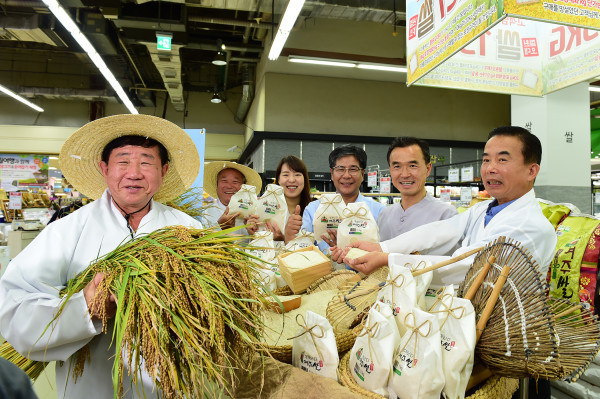 경기 여주시는 16일 서울 서초구 소재 농협하나로클럽 양재점에 시에서 올해 첫 수확한 ‘여주햅쌀’을 출하했다. 사진은 이항진 시장(오른쪽 두번째)을 비롯한 관계자들이 여주햅쌀을 홍보하고 있는 모습. (사진제공=여주시청)