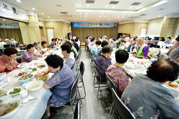경기 수원시 팔달구 화서1동은 최근 동 행정복지센터에서 새마을부녀회 주관으로 지역내 노인을 초대해 '복달임 행사'를 개최했다. 사진은 참여자들이 오리백숙을 먹고 있는 모습. (사진제공=팔달구청)