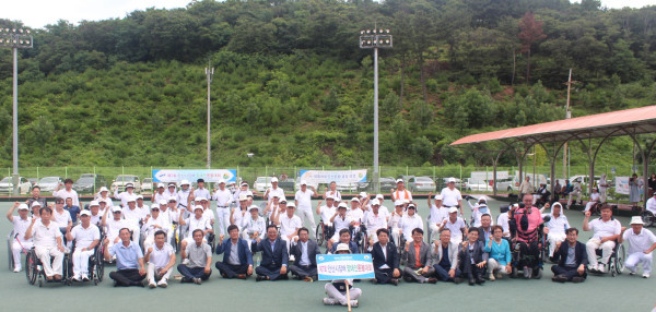 경기 안산시는 지난 13일 안산시 능안운동장 론볼 경기장에서 '제7회 안산시장배 장애인 론볼대회'를 개최했다. 사진은 참여자들이 기념촬영을 하고 있는 모습. (사진제공=안산시청)