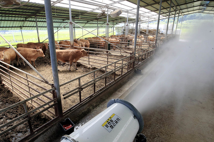 전국에 폭염이 계속되면서 가축관리에 비상이 걸린 17일 오전 광주 북구 충효동의 한 축사에서 광주 북구청 경제산업과 농축산유통팀 직원들이 내부온도를 낮추기 위해 살수차를 이용해 물을 뿌리고 있다.