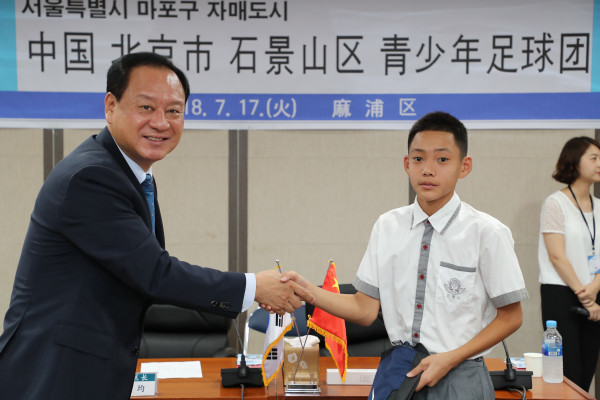 마포구는 17일 오전 자매도시인 중국 북경시 석경산구의 청소년축구단을 초청해 환영식을 가졌다. 사진은 구청 중회의실에서 열린 이번 환영식에서 유동균 구청장이 석경산구 학생에게 선물을 전달하는 모습. (사진제공=마포구청)