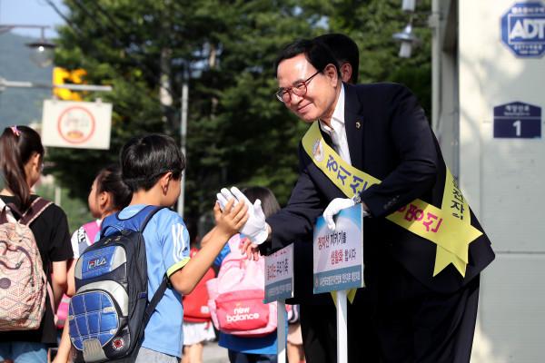 이용범 인천시의장이 17일 아침 계산초등학교 인근에서 민·관·경 합동 '어린이교통사고 줄이기 캠페인'에 동참해 아이들과 인사를 나누고 있다. 이 의장은 앞으로도 교통안전 캠페인에 적극 동참하겠다는 뜻을 밝혔다.