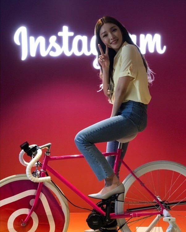 사진에서 청하는 일명 인별그램 배경과 그 로고를 연상시키는 자전거를 타고 포즈를 취하고 있다. 여유있는 사이즈의 노란 티셔츠와 청바지를 입고도 빛나는 청하의 몸매가 눈길을 끈다.