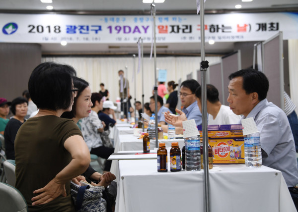광진구는 18일 오후 2시 구청 대강당에서 ‘2018 광진 19데이(일자리 구하는 날)’ 행사를 열었다. 인근 동대문구와 중랑구가 함께하는 이번 행사는 일자리를 찾는 청·장년층과 중소기업을 연계해 지역 일자리 활성화에 기여하기 위해 마련됐다. 사진은 행사에서 구인기업과 구직자가 면접을 진행하고 있는 모습. (사진제공=광진구청)