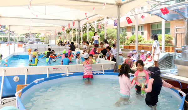 경기 수원 광교신도시에 있는 산의초등학교가 운동장에 풀장을 만들어 지난 17일 개장했다. 지난 18일 오후 학생들이 풀장에 들어가 물놀이를 하고 있다.