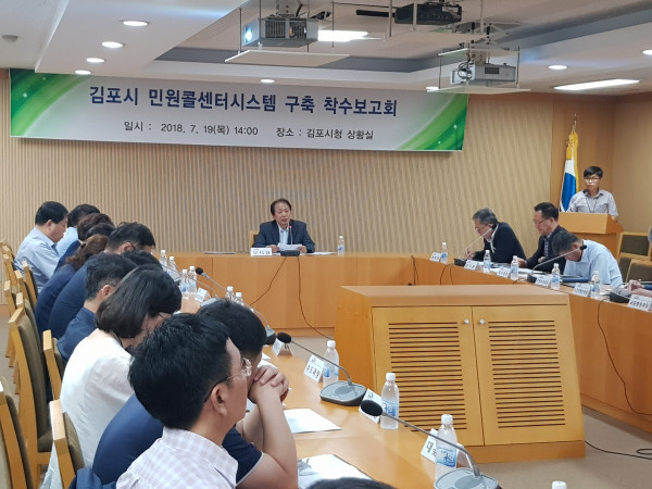 경기 김포시는 19일 시청 상황실에서 장영근 부시장을 비롯한 각종 민원관련 부서장 등 50여명이 참석한 가운데 '김포시 민원콜센터시스템 구축 착수보고회'를 개최했다. 사진은 참여자들이 회의하고 있는 모습. (사진제공=김포시청)