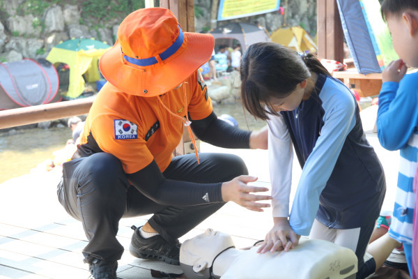 관악소방서는 지난 21일 본격적인 휴가철을 맞아 안전사고 발생이 예상됨에 따라 신림동 소재 관악산 물놀이장에서 이용객들을 대상으로 심폐소생술 교육 및 안전수칙 교육을 진행했다. 사진은 심폐소생술을 배우는 어린이의 모습. (사진제공=관악소방서)