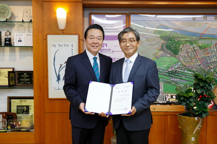 | ▲ 노현송 구청장(왼쪽)이 문병인 이화의료원장을 미라클메디특구협의회장으로 위촉한 후 함께 기념촬영을 하고 있다.(사진제공=강서구청) | ||