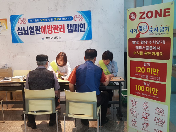 | ▲ 강서구보건소 주관으로 ‘심·뇌혈관 예방관리 캠페인’이 진행 중인 모습. (사진제공=강서구청) | ||