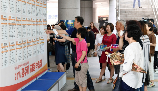 경기 광주시와 광주하남상공회의소가 공동 주최한 ‘2018년 제2회 광주시 채용박람회’가 지난 19일 시청 2층 로비에서 열렸다. 400여명의 구직자가 참여해 성황리에 개최된 가운데 행사 참가자들이 일자리현황판을 살펴보고 있다. (사진제공=광주시청)