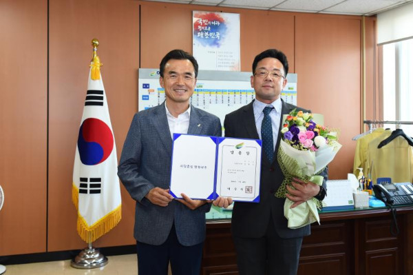 지난 20일 경기 여주시 부시장에 김현수 지방부이사관이 부임했다. 김 부시장은 취임식 없이 이항진 시장과 각 부서를 순회하면서 상견례를 했다. 사진은 이 시장(왼쪽)과 김 부시장이 임명장 수여식 후 기념촬영을 하는 모습. (사진제공=여주시청)