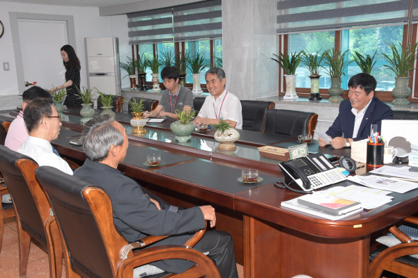 경기 '동두천시축구협회의 60대'는 23일 어려운 이웃을 위한 기탁금 100만원을 동두천시에 전달했다. 사진은 최용덕 시장 및 이금로 60대 축구협회 회장 등이 이야기를 나누고 있는 모습. (사진제공=동두천시청)