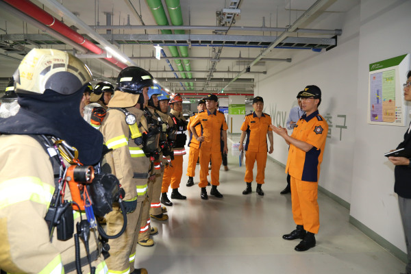 서울 영등포소방서는 지난 19일 오전 여의도 국제금융센터 IFC에서 집중훈련을 통한 소방력 활용의 효율성 극대화를 위해 ‘재난대응 현지적응훈련’을 실시했다. 사진은 훈련에 앞서 서순탁 서장이 지시사항을 전달하고 있는 모습. (사진제공=영등포소방서)