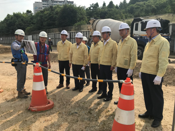 서울시의회 도시안전건설위원회는 23일 서남물재생센터를 긴급방문해 고도처리 및 시설현대화사업이 한창 진행 중인 공사현장을 점검하고, 현장관계자들로부터 폭염 대응현황을 보고 받았다. 사진은 현장관계자로부터 공정에 대한 설명을 듣고 있는 김기대 위원장 등 위원들의 모습. (사진제공=서울시의회)