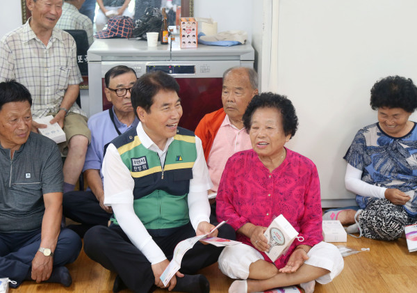 백군기 경기 용인시장은 23일 포곡읍 삼계4리 경로당을 방문해 지역노인들의 건강상태를 확인하고, 역삼동 명지대사거리에서 시민들에게 시원한 생수를 전달했다. 사진은 경로당을 찾은 백 시장이 노인들과 환담을 나누는 모습. (사진제공=용인시청)