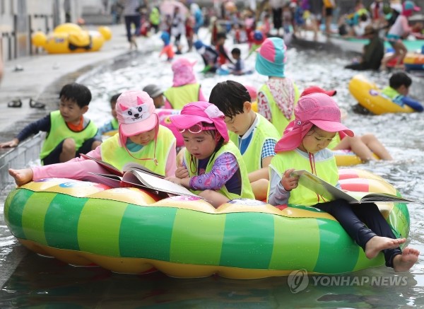 24일 서울 송파구 성내천에서 어린이들이 물놀이를 하며 독서하는 모습을 연출하고 있다. 송파구는 성내천 물놀이장에 도서를 비치하고, 파라솔과 테이블 등 독서 공간을 제공하는 '여름행복문고'를 오는 이달 말까지 운영한다.