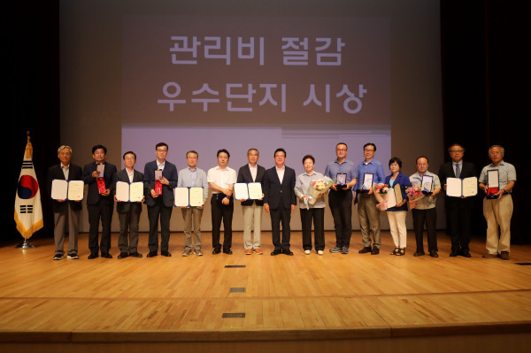 최근 서울 강남구는 강남구민회관에서 1200여명의 의무관리단지 동별 대표자를 대상으로 공동주택 관련 법령과 관리규약 준칙, 장기수선 계획 등의 공동주택 동별 대표자 교육을 실시하고, 관리비 절감 우수 단지 대표자에게 상패와 상장을 수여했다. 사진은 정순균 구청장(가운데)이 수상자들과 기념촬영을 하고 있는 모습. (사진제공=강남구청)