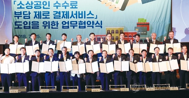 25일 오전 서울 중구 대한상공회의소에서 열린 ‘소상공인 수수료 부담 제로 결제서비스’ 도입을 위한 업무협약식에서 홍종학 중소벤처기업부 장관, 박원순 서울시장, 최승재 소상공인연합회장을 비롯한 참석자들이 협약서에 서명한 뒤 포즈를 취하고 있다.