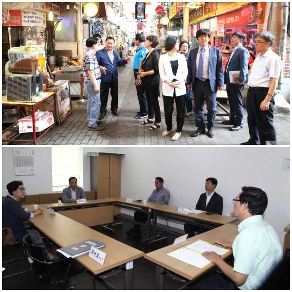 | ▲ (위)행정기획위원회 위원들이 창동신창시장을 현장방문해 시장을 둘러보고 있는 모습, (아래)복지건설위원회 위원들이 무수골데이케어센터를 방문해 안전사고와 관련한 현황보고를 받는 모습. (사진제공=도봉구의회) | ||