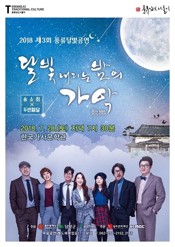 광주광역시가 주최하고 광주문화재단과 광주MBC가 공동주관하는 풍류달빛공연은 오는 28일 오후 7시30분 담양 한국가사문학관에서 만날 수 있다.