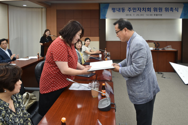 경기 남양주시는 25일 시청 푸름이방에서 조광한 시장을 비롯한 시 관계자들이 참석한 가운데 총 25명의 제2기 평내동 주민자치위원에게 위촉장을 수여했다. 사진은 조 시장이 한 위원에게 위촉장을 수여하는 모습. (사진제공=남양주시청)