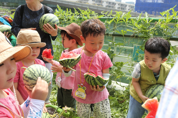 금천구는 26일 오전 11시 구청 내 옥상텃밭 ‘금나래하늘텃밭’에서 어린이집 아이들과 ‘수박따기’ 체험 행사를 개최했다. 사진은 행사에 참여한 어린이집 아이들이 자신이 딴 수박을 먹고 있는 모습.(사진제공=금천구청)