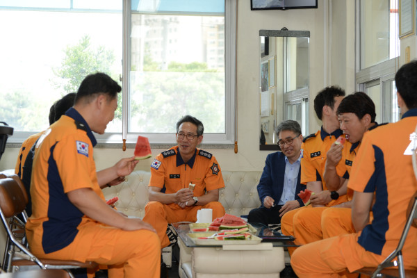 이재열 경기도 재난안전본부장은 지난 27일 안성소방서 공도119안전센터를 방문해 연일 지속되는 폭염 속에서도 도민 안전을 위해 힘쓰는 현장대원들을 격려했다. 사진은 이 본부장(가운데)과 대원들이 환담을 나누고 있는 모습.(사진제공=안성소방서)