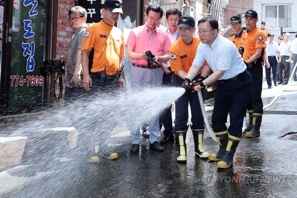 김부겸 행정안전부 장관이 30일 오전 서울 용산구 쪽방촌을 방문해 폭염에 취약한 사회적 약자에 대한 대책을 점검하고 소방공무원들과 함께 골목에 살수하고 있다.